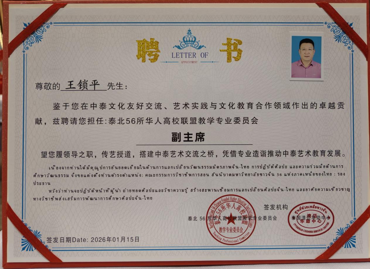 受中泰两国政府邀请“中泰建交50周年”文化艺术国际学术访问交流首席艺术家,特聘请王锁平作为中国唯一担任泰国TH泰北56所华人高等院校联盟教学委员会副主席一职及56所华高校书画艺术客座教授。王锁平向泰国高等艺术院校捐赠其出版的《泰国高等艺术院校教学案例王锁平国画作品集》,王锁平系列作品集列为泰国书画艺术教育范本及博士生研究课题。