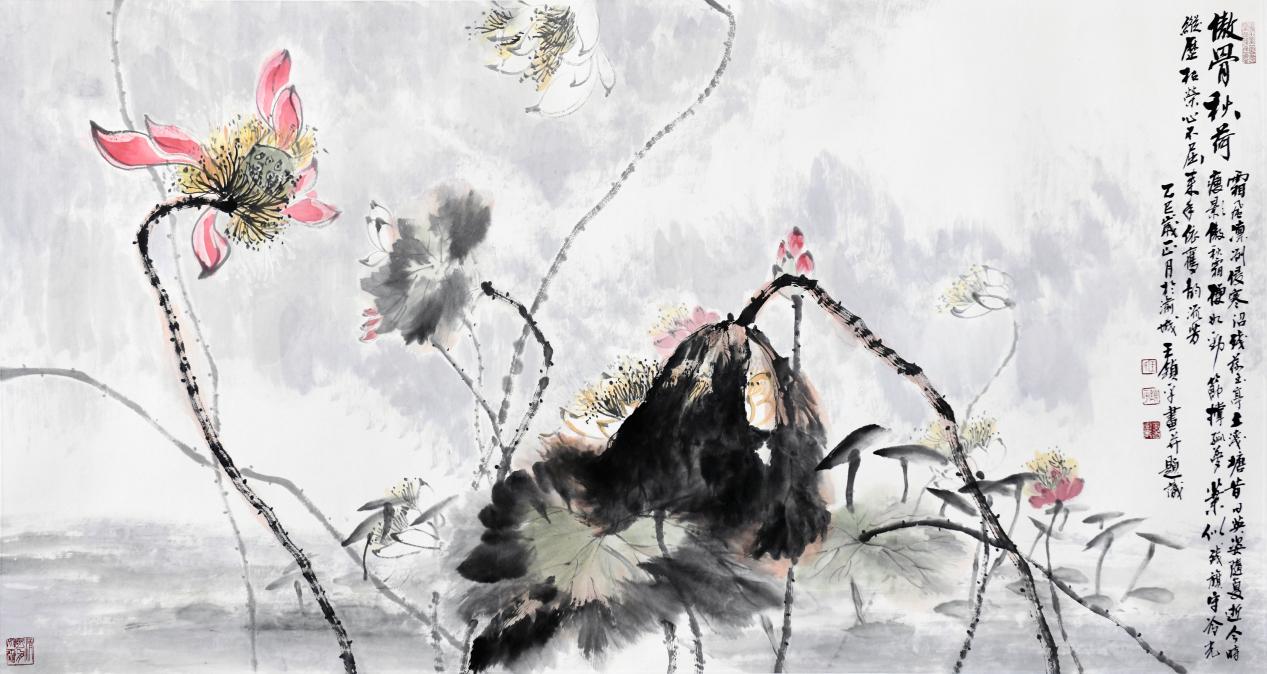 王锁平在诗歌、书法、绘画方面都有着较高的造诣,可谓是才华横溢,触类旁通。他的书画作品很多都被国家顶级的艺术机构所收藏,比如国家博物馆、比如人民大会堂、比如中国美术馆,这些都是很多书画家极为仰慕的艺术殿堂。他擅长泼墨写意的山水和花鸟,他的用笔可谓是皴擦点染,泼墨大胆,浓淡干湿,变化万千。比如他的山水:气韵生动,妙趣横生;他的荷花可以说是融汇了古代的石涛、八大、徐渭、张大千等等经典画家的笔墨和意趣。所以他的画面给人一种夸张变形的形式效果,摆脱了那种自然再现的束缚,凸显出荷花的精神气象。无论是含苞待放还是盛开绽放,都能给人一种天真烂漫,绚丽多姿的勃勃生机。完美的诠释出了“丹青难写是精神”的意境。
