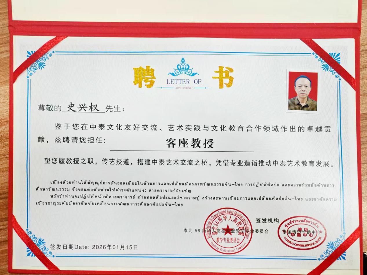为庆祝中泰建交50周年,深化中泰人文交流与教育合作,由泰国清迈华助中心联合泰北56所华人高校联盟教学专业委员会牵头主办的“中泰建交50周年国际艺术展暨学术访问交流活动”,近日在崇华新生华立学校隆重举行。史兴权先生应邀担任客座教授一职。