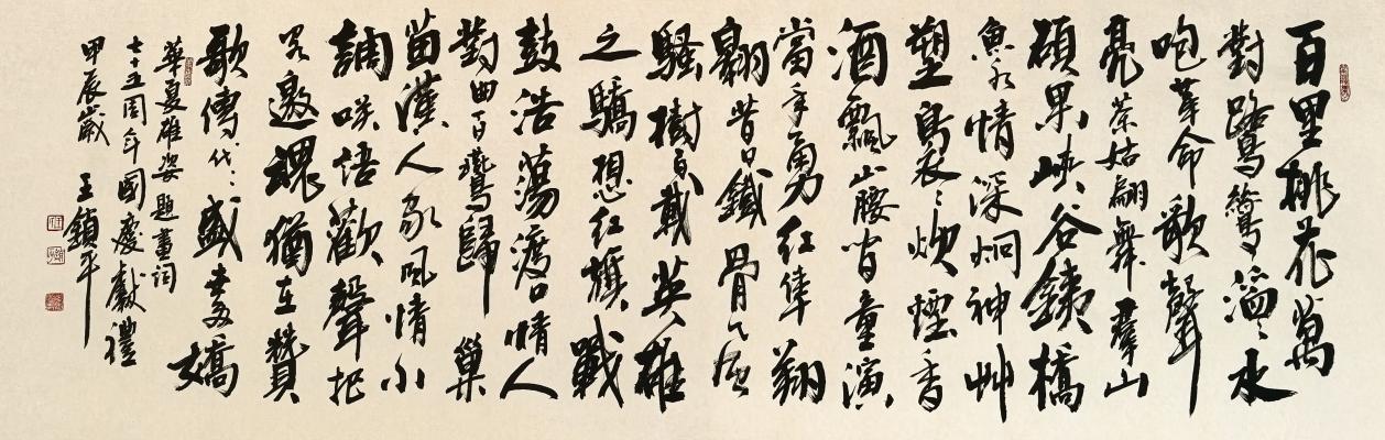 正大气象作翰墨 虬龙蜿蜒时代功 ——记著名书画家王锁平 书法的秘籍,在于碑帖之中,当代书家历练翰墨,当以探索隐藏在碑帖里的法度为选择,才可以令书道渊妙代不绝人。王锁平先生就是一位向碑帖取法的大手笔,他的书法兼修碑之风骨与帖之风度,写出了刚柔相济,可以叩击山河的正大气象。在他的书法作品里一—观览,有诸书皆成的博涉多优,更有行草洒脱的游目骋怀!是一位执笔在手,运笔在心,可以把书法写得龙跳天门,虎卧凤阙,足足的精气神,是谓书坛的一支笔! 王锁平习成书法,非常重视书法线条的塑造效果,把书法特别是行草本为线条艺术的真谛表现的无以复加。凌空杀纸写下《云水襟怀》笔未到气已吞,笔势如惊雷驰电,扑面而成,果然是落笔觉着痛快,起笔丰姿多神。这榜书大字,足以见证王锁平运化笔墨的窠擘功夫!力度之威猛,犹如鸿飞兽骇,力透纸背。在低旋回翔之际,作一横如布阵排云,作一牵似万岁枯藤。笔里有墨,墨里有笔,尽是秋鹰逐兔的万千万变。赵子昂论书法,有用笔千古不易之言,如今看王锁平先生写下的这书法,亦是不易经典。挂起来一经入目,必然是令人大振心颜,一派正大气象!
